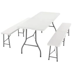 Of het nu een verjaardagsfeestje, een barbecue of camping is – de opvouwbare Bayreuth bierset bestaande uit een grote tafel en twee bierbanken nodigt uit tot een gezellig samenzijn. Hij is snel opgezet in de tuin, op het balkon of op het terras. Daarna kan de tuinmeubelset dankzij de kofferfunctie weer plaatsbesparend worden opgeborgen. Dankzij de handvatten en het lage gewicht is hij zeer comfortabel te dragen. Vloerbeschermers voorkomen lelijke krassen op de vloer. Hierdoor kan de set ook binnen gebruikt worden.