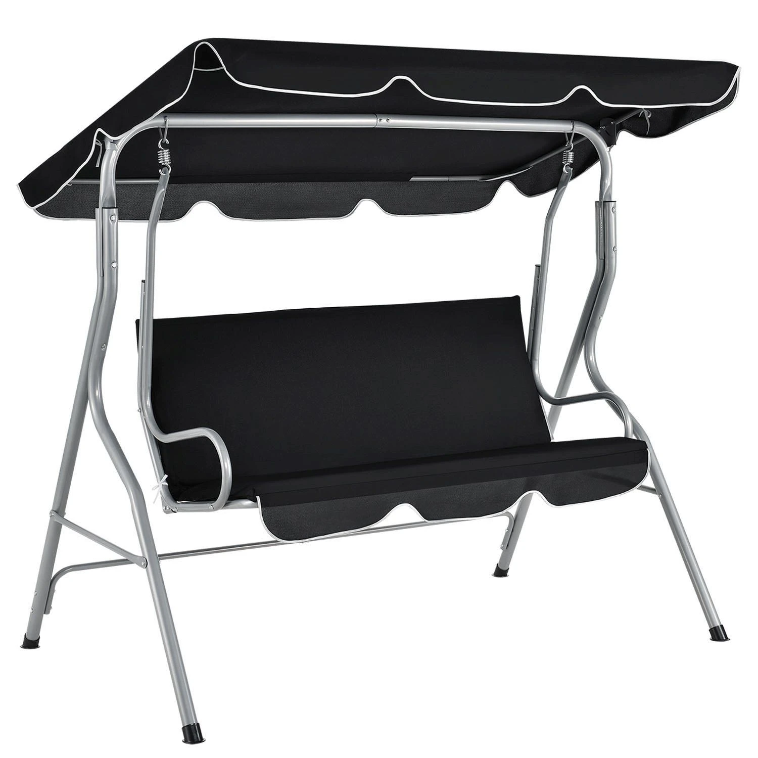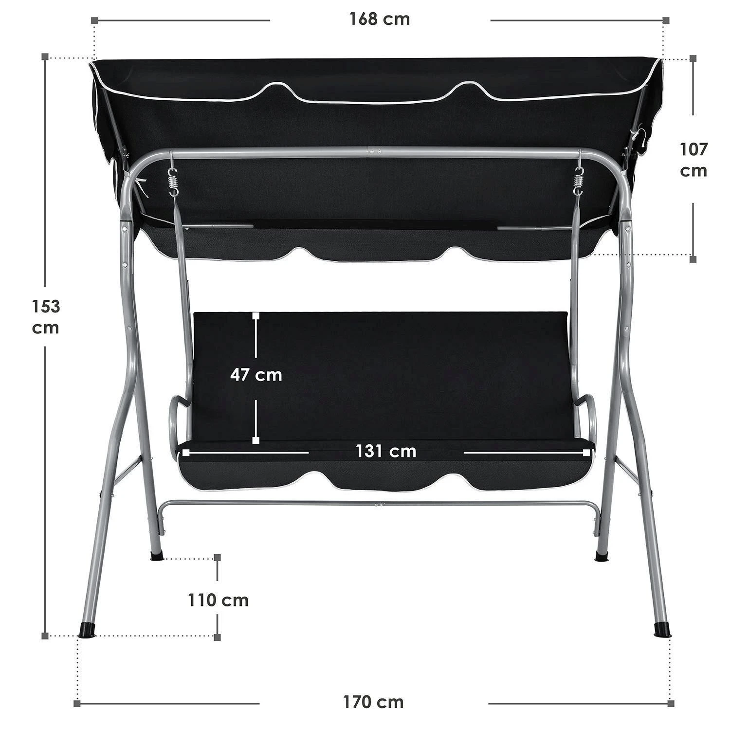Laat de stress van alledag achter u en geniet van het mooie weer in de gezellige 3-zits hangmatschommel Cecina (zwart) met schuifdak. Op de 131 cm brede bank kunnen maximaal 3 personen zitten. De dikke stoelbekleding biedt zelfs urenlang een hoog zitcomfort. Na een zware dag kunt u zich terugtrekken in de tuin, het terras of het balkon met een goed boek of een glas wijn en genieten van het mooie zomerweer. Dankzij het verstelbare zonnedak zit je ook bij felle zon comfortabel in de schaduw