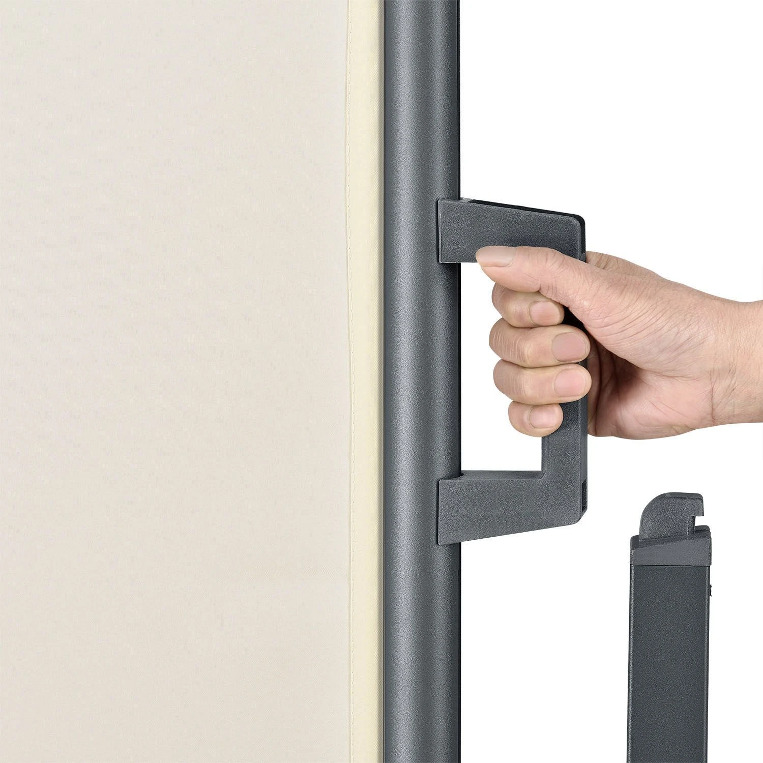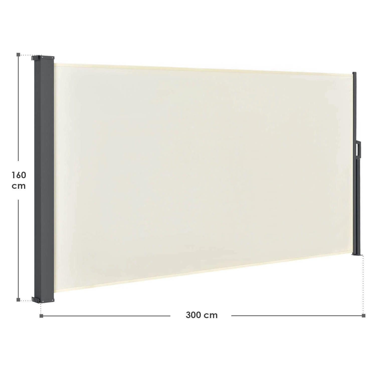 Met onze uitschuifbare zijluifel Dubai in de kleur beige maakt u zeker de juiste keuze. Het 1,60 meter hoge en 3 meter lange zijjaloezie overtuigt door een modern design, weerbestendige materialen en een individueel instelbare lengte. Bescherm je balkon of terras tegen zon, wind en nieuwsgierige blikken van je buren. Met onze zijluifel staat niets een gezellig zondagsontbijt en lange zomeravonden in de tuin in de weg.