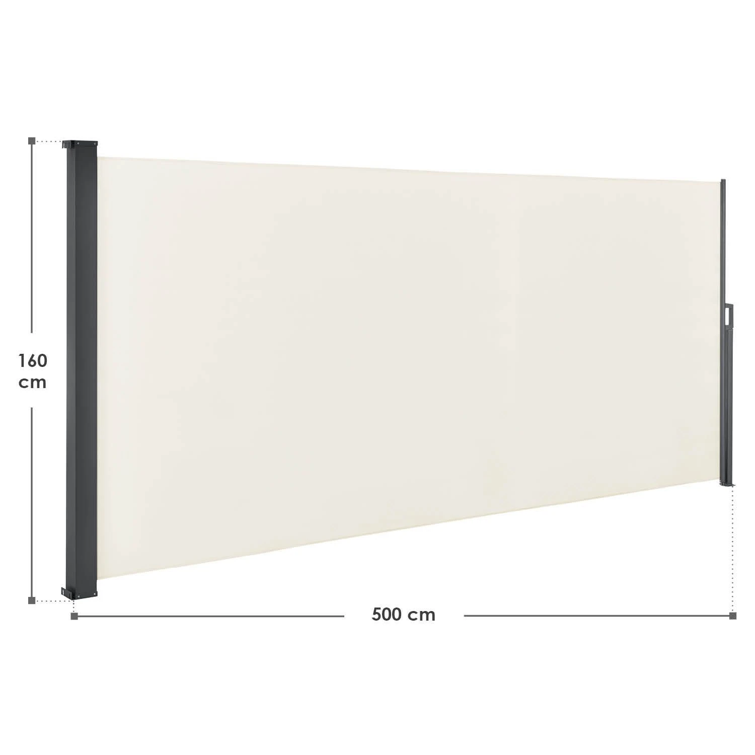 Met onze uitschuifbare zijluifel Dubai in de kleur beige maakt u zeker de juiste keuze. Het 1,60 meter hoge en 5 meter lange zijjaloezie overtuigt door een modern design, weerbestendige materialen en een individueel instelbare lengte. Bescherm je balkon of terras tegen zon, wind en nieuwsgierige blikken van je buren. Met onze zijluifel staat niets een gezellig zondagsontbijt en lange zomeravonden in de tuin in de weg.
