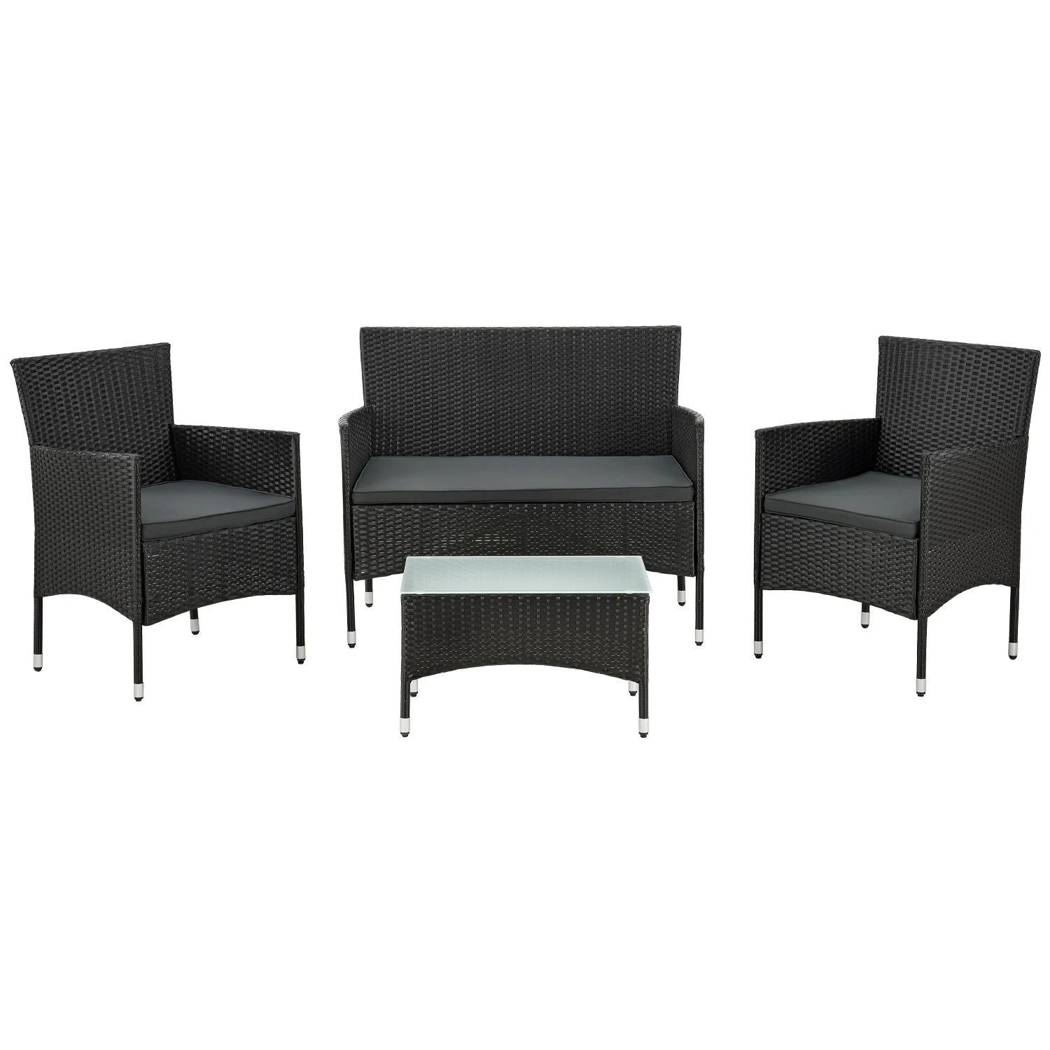 De poly rotan zitgroep Fort Myers (zwart met donkergrijze hoezen) dient als comfortabele lounge voor 4 personen. Met de edele rotan-look verfraait hij elke tuin, terras of balkon. Uitgerust met een rugleuning en kussens, is de tuinset perfect om vele uren door te brengen met familie en vrienden. De 4-delige tuinmeubelset met stevig metalen frame bestaat uit een 2-zitsbank, twee fauteuils en een klein bijzettafeltje met een glazen blad. De balkonset is geschikt om gasten in stijl te ontvangen. Zet drankjes en hapjes op tafel en geniet samen van de zomer.