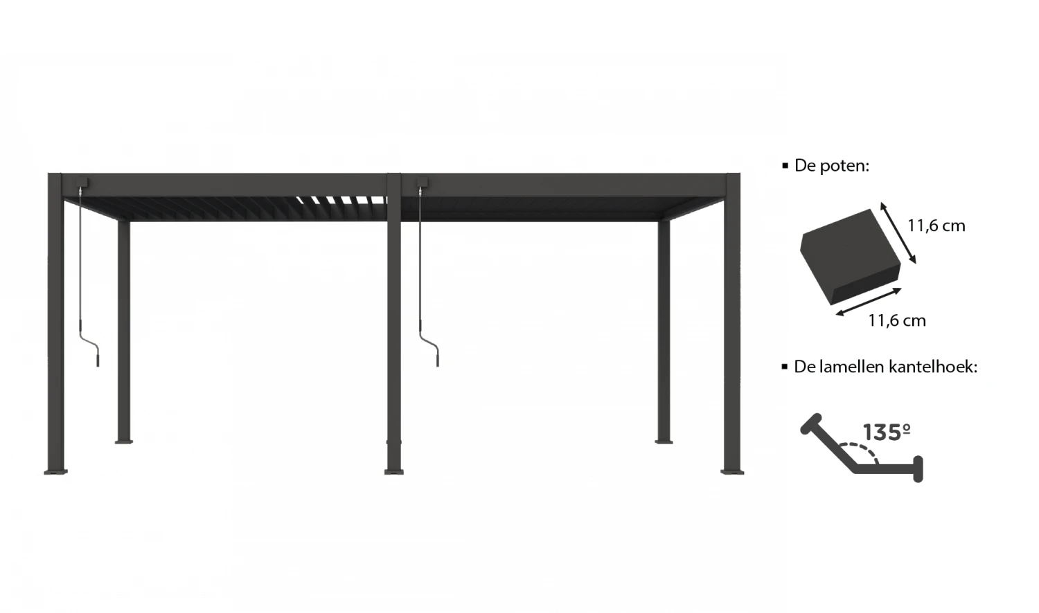 De Novum ORION overkapping 360 x 530 is volledig gemaakt van aluminium. Het frame is gemaakt van stevig aluminium dat is behandeld met een poedercoating om roest en corrosie te voorkomen. Daarnaast beschikt deze overkapping over extra dikke poten van 116 x 116 mm. Dit zorgt voor een robuuste uitstraling. Alle schroeven zijn volledig RVS. Door de keuze voor deze hoogwaardige materialen is deze pergola zonder problemen het gehele jaar door te gebruiken. En dat voor jaren lang!