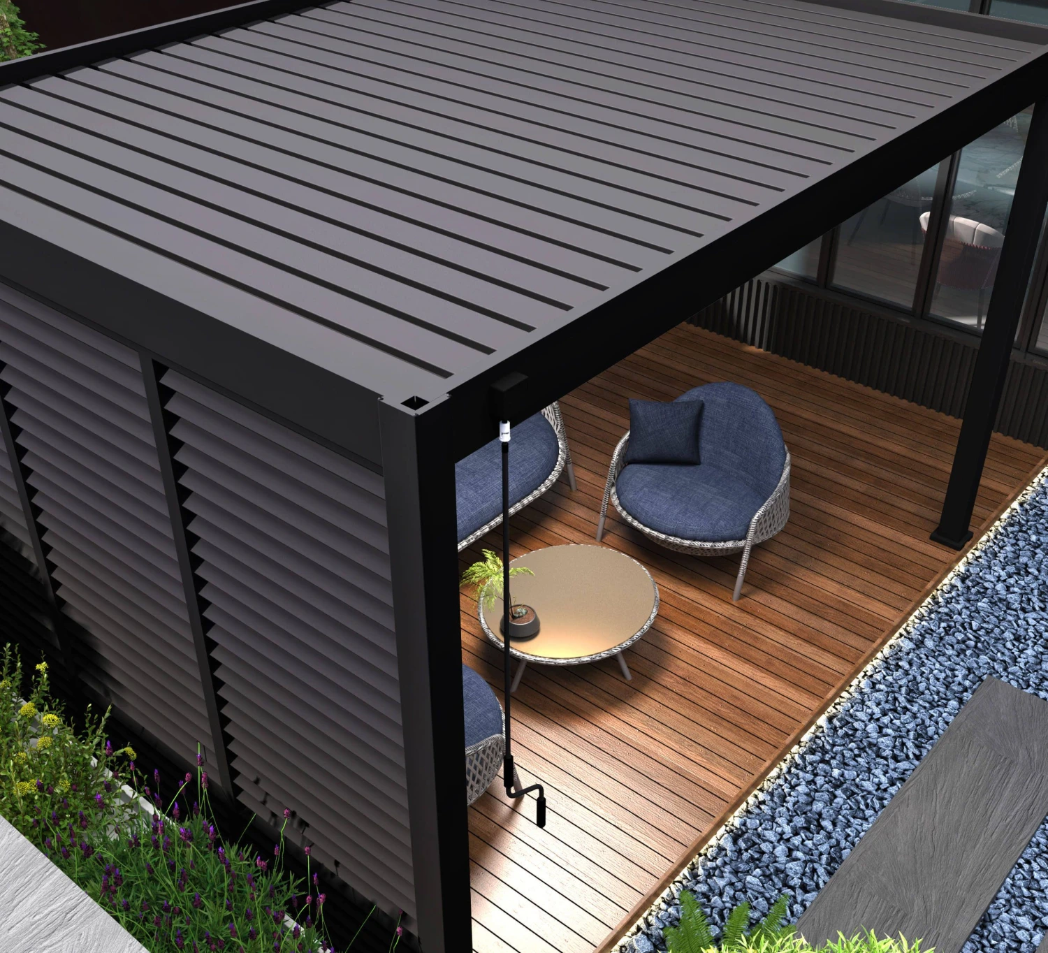 Orion kantelbaar shutter paneel voor Orion Pergola – 123 x 235 cm – voor 4m kant – antracietHet Orion kantelbare Shutter paneel is een echte toevoeging voor jouw Orion overkapping. Met dit paneel zorg je gemakkelijk voor meer privacy, zit je beschut tegen de wind en heb je geen last van een laaghangende zon. Daarnaast zijn de lamellen van dit shutter paneel handmatige te verstellen zodat u altijd in comfort kunt genieten van uw overkapping. De vaste middenlat maakt het mogelijk de bovenste en onderste lamellen van de horizontale lamellenwand onafhankelijk van elkaar te bedienen. Hierdoor kan de lichtinval en schaduw naar wens worden ingesteld.Uniek ontwerpDoor het unieke ontwerp bevestig je het zijscherm volledig geïntegreerd in jouw pergola. Met de meegeleverde handleiding is het monteren van het kantelbare shutter paneel zeer eenvoudig. Het paneel is gemaakt van aluminium. De panelen worden per stuk geleverd. Je hebt 3 panelen nodig om een kant van 4 meter volledig af te dekken. Deze panelen zij modulair. Dit houdt in dat je de panelen op elke kant kan plaatsen zoals je dit wilt.Belangrijke informatieHet Orion kantelbaar shutter paneel wordt per stuk geleverd3 shutter panelen bedekt een 4 meter kant volledigDe vaste middenlat zorgt ervoor dat de bovenste en onderste lamellen afzonderlijk bediend kunnen wordenHet Orion Shutter paneel is 123 cm (breedte) x 235 cm (hoogte)
