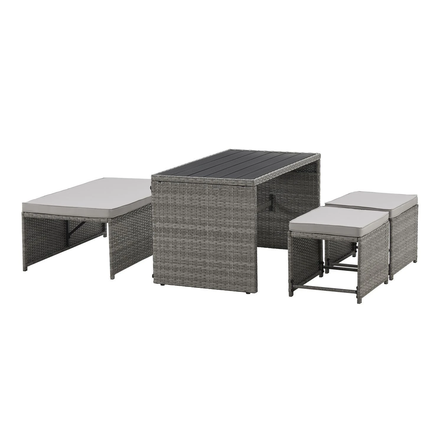 De 2in1 polyrotan Relax tuinmeubel Jamaica in grijs bestaat uit een tafel, bank en krukken. Gebruik de set als comfortabele bank of als zithoek met tafel. De bank doet ook dienst als bank en tafel als je de tafel 90 graden draait. De multifunctionele zitgroep voor 2 tot 4 personen is vooral geschikt waar weinig ruimte is, zoals voor een klein balkon, tuin of op de camping. De moderne lounge is gemaakt van polyrotan en is weerbestendig, onderhoudsvriendelijk en duurzaam.