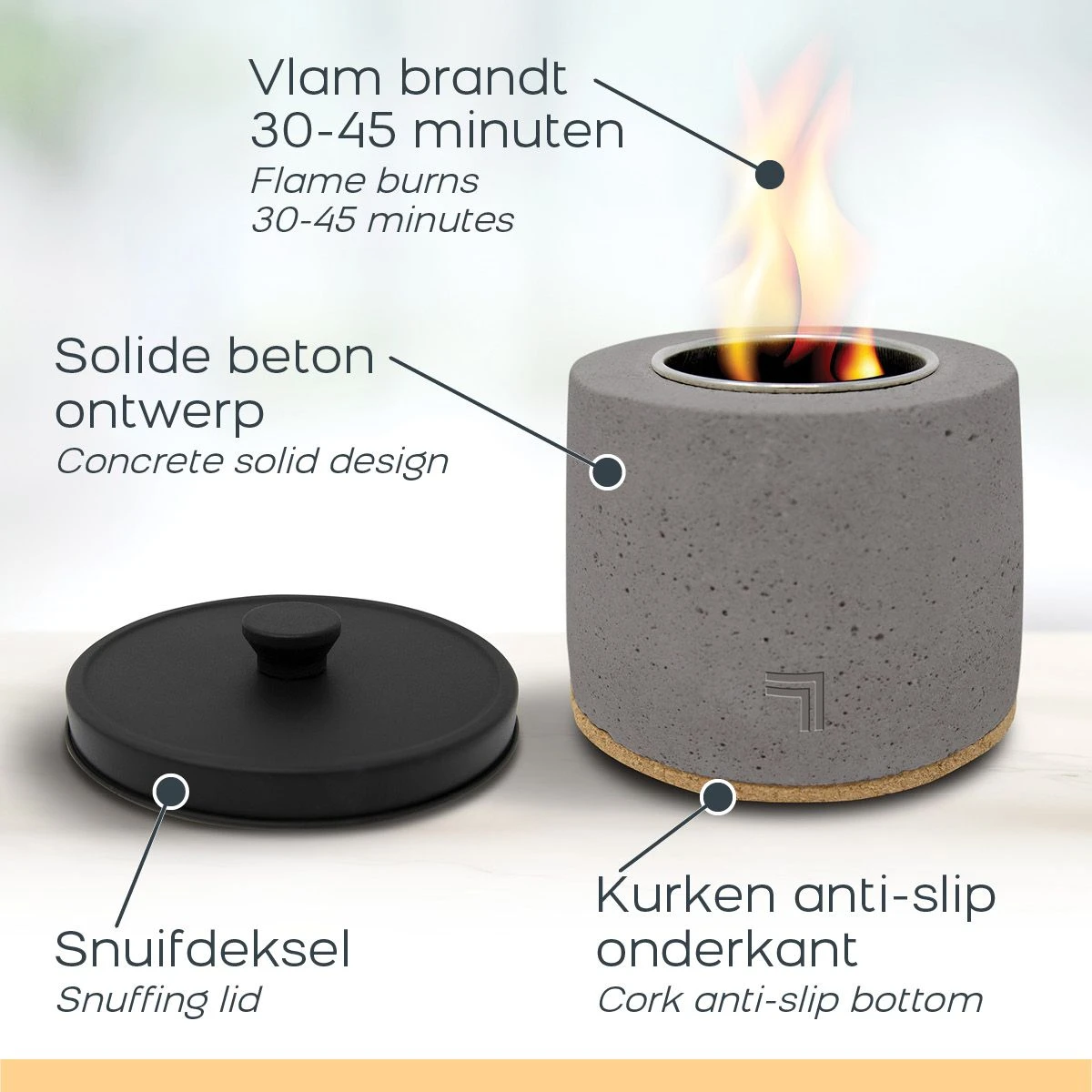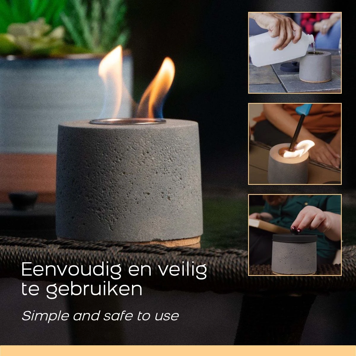 Het tafelbladontwerp creëert een rustgevende vlam zonder dat er brandhout nodig is. Voor de Tableop Fire Pit heb je slechts bio ethanol nodig (niet inbegrepen). Deze brandstof is geurloos en geeft een rookloze vlam. Vul de roestvrijstalen maatbeker met bio-ethanol en steek de brandstof aan met een langwerpige lucifer of aansteker. Je kun de haard eenvoudig uitzetten door de vuur dovende deksel op de sfeerhaard te plaatsen. Wanneer je de brandstof aanvult tot de max streep, brand de vlam voor ongeveer 30-45 minuten. Zorg ervoor dat deze volledig gedoofd is voordat je nieuwe brandstof aanvult en aansteekt.