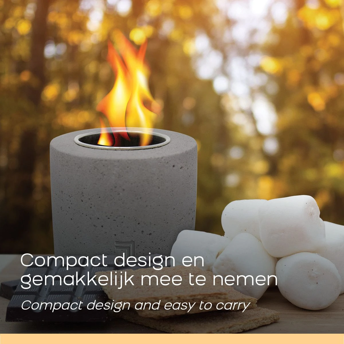 Doordat de brandstof rookvrij en geurloos is, kun je de mini fire pit ook goed gebruiken voor het roosteren van marshmallows voor bijvoorbeeld s’mores. Dankzij het compacte design kun je de sfeerhaard gemakkelijk meenemen. Van de tuin tot de camping. Jij creëert gezellige avonden buiten met vrienden en familie rond een echt vuur.
