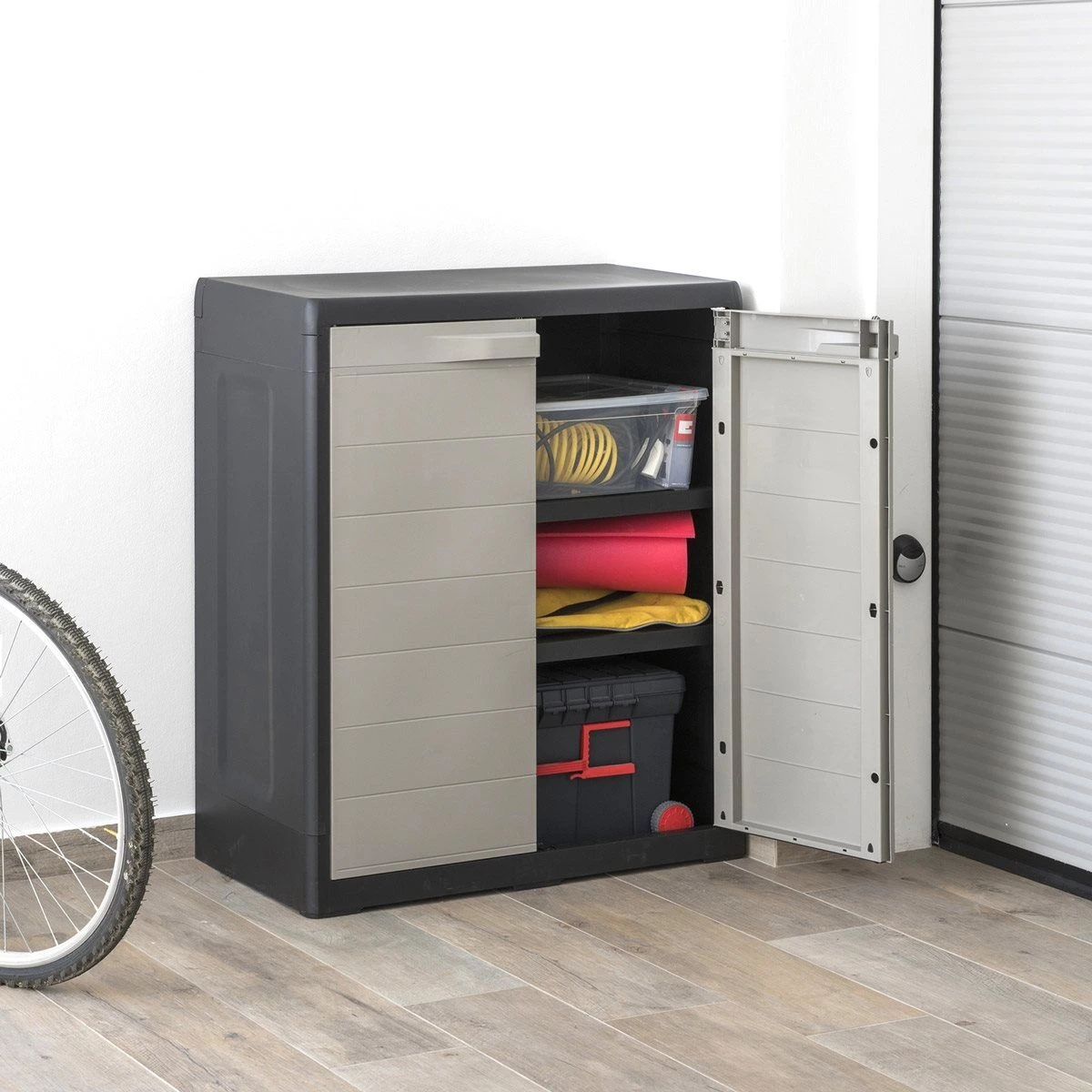 Toomax Elegance XL opbergkast laag – lichtgrijs/antracietDe Toomax Elegance XL opbergkast laagis de perfecte oplossing voor het opbergen van kussens, tuinaccessoires en andere spullen in je tuin of in je garage. Deze stijlvolle en multifunctionele opbergkast biedt een combinatie van gebruiksgemak, duurzaamheid en een aantrekkelijk ontwerp. De opbergkast beschikt over een hangslotvoorziening zodat je de box volledig kan afsluiten. (hangslot niet meegeleverd). Deze opbergkast heeft 2 planken waar je 30 kg op kunt plaatsen.Makkelijk in gebruikDeToomax Elegance XL opbergkast laagis gemakkelijk in elkaar te zetten door middel van klikverbindingen. Hiervoor is geen gereedschap benodigd.KenmerkenGeschikt voor binnen (en buiten overdekt)SpatwaterdichtAfmetingen 78 (breedte) x 46 (diepte) x 94 (hoogte) cmAfmeting binnenmaat 77 (breedte) x 38,5 (diepte) x 90,5 (hoogte) cmdraaggewicht per plank: 30 kgKan worden vastgemaakt aan de muurKan op slot worden gedaan